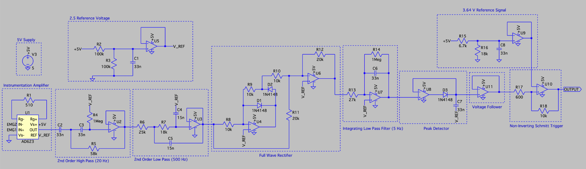 This is an item in your portfolio. It can be have images or nice text. If you name the file .md, it will be parsed as markdown. If you name the file .html, it will be parsed as HTML. Designed and 3D-printed a Spider-Man webslinger prosthetic for young hand amputees, allowing them to shoot webs like Spider-Man using EMG signals. I built an EMG circuit using analog filters, a full-wave rectifier, an envelop, a digitizer, and an Arduino to control a Spider-Man webslinger mechanism. I used LTSPice to simulate the EMG circuit schematic to facilitate the development the EMG circuit design.